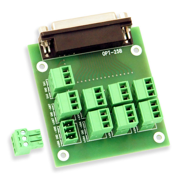 The OPT-25D is a standard terminal board fitted with one D-Sub 25 connector (female), 26 screw terminals (25 signals + cable shield) and two auxiliary terminals for connecting an external power supply.
