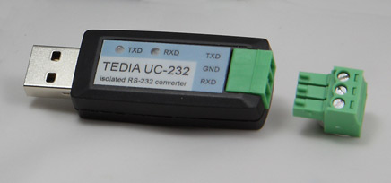 The connection of the converter serial line COM port is realized by a plug-in screw terminal block, allowing the user to easily attach the cables. Because the unit has three terminals, the UC-232 converter provides just the basic data signals - TXD and RXD.